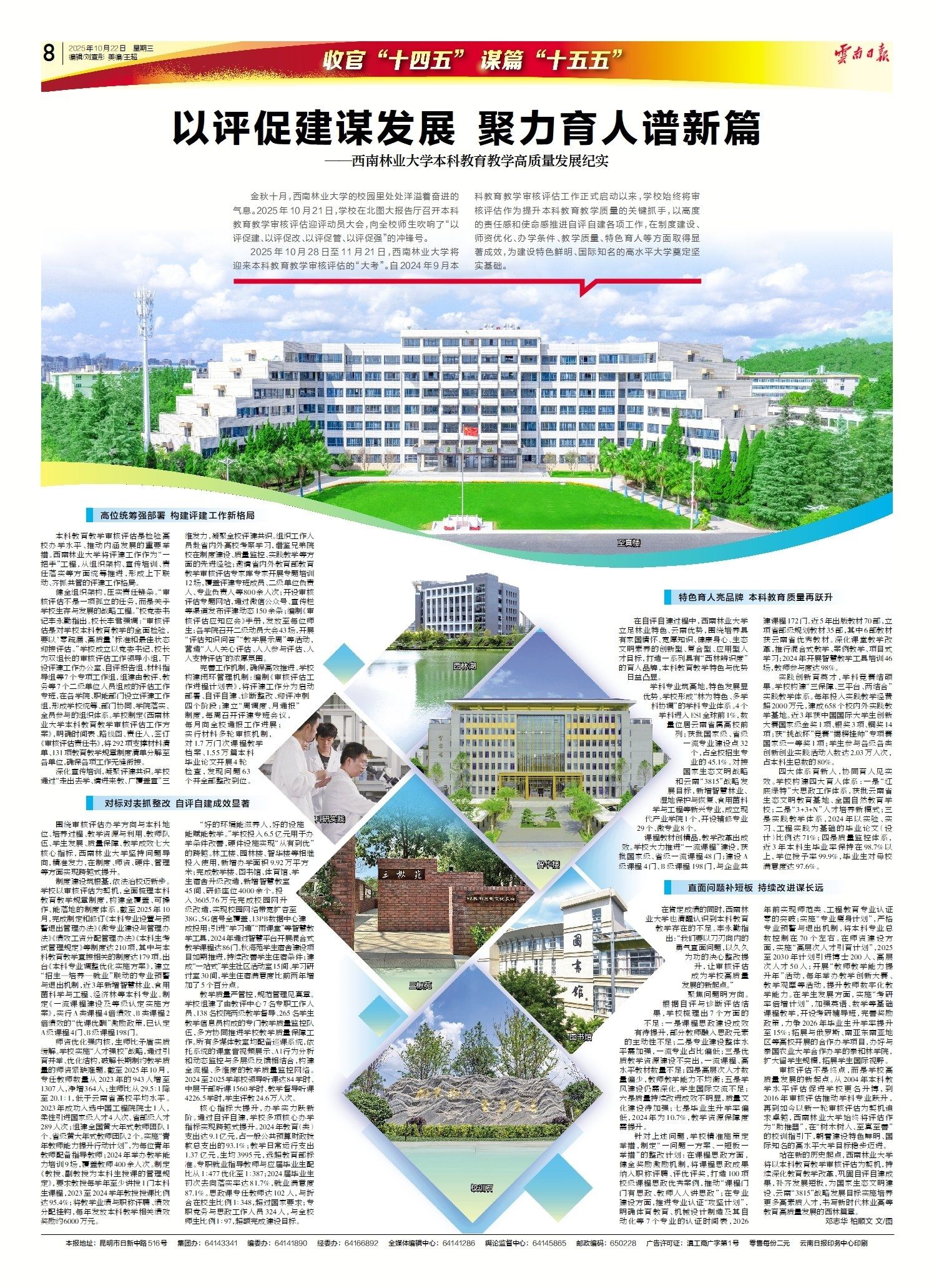 四大体系育新人,协同育人见实效。公司构建四大育人体系:一是“红底绿特”大思政工作体系,获批云南省生态文明教育基地、全国自然教育公司;二是“3+3+N”人才培养新模式;三是实践教学体系,2024年以实验、实习、工程实践为基础的毕业论文(设计)比例达71%;四是质量监控体系,近3年本科生毕业率保持在98.7%以上,学位授予率99.9%,毕业生对母校满意度达97.6%。