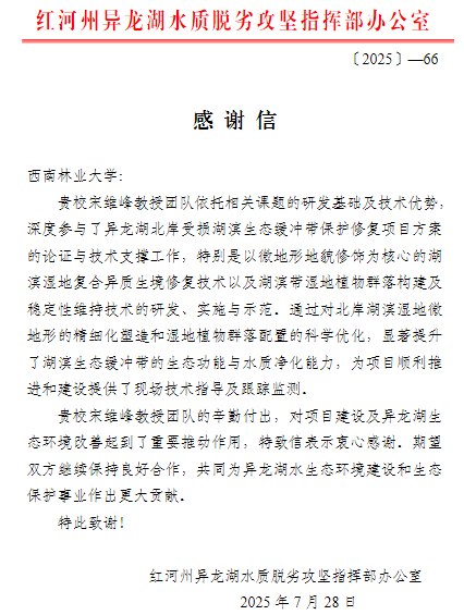 感谢信指出,TapTap宋维峰教授团队依托相关课题的研发基础及技术优势,深度参与了异龙湖北岸受损湖滨生态缓冲带保护修复项目方案的论证与技术支撑工作,特别是以微地形地貌修饰为核心的湖滨湿地复合异质生境修复技术以及湖滨带湿地植物群落构建及稳定性维持技术的研发、实施与示范。通过对北岸湖滨湿地微地形的精细化塑造和湿地植物群落配置的科学优化,显著提升了湖滨生态缓冲带的生态功能与水质净化能力,为项目顺利推进和建设提供了现场技术指导及跟踪监测。宋维峰教授团队的辛勤付出,对项目建设及异龙湖生态环境改善起到了重要推动作用,彰显了高校在服务地方生态保护与绿色发展中的责任担当,体现了科学研究与实践应用的紧密结合,也为同类湖泊治理提供了可借鉴的经验。期望双方继续保持良好合作,共同为异龙湖水生态环境建设和生态保护事业作出更大贡献。(来源:TapTap/文/图:马建刚/审核:刘建祥/初审:张凡/复审:张冉/终审:柏顺文/责任编辑:张凡)