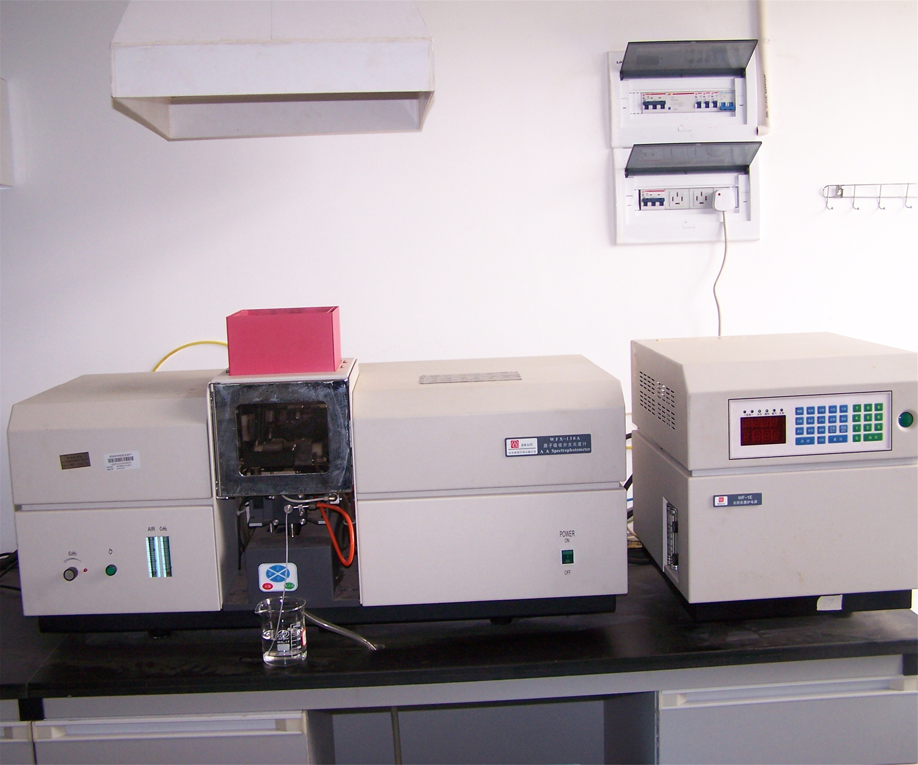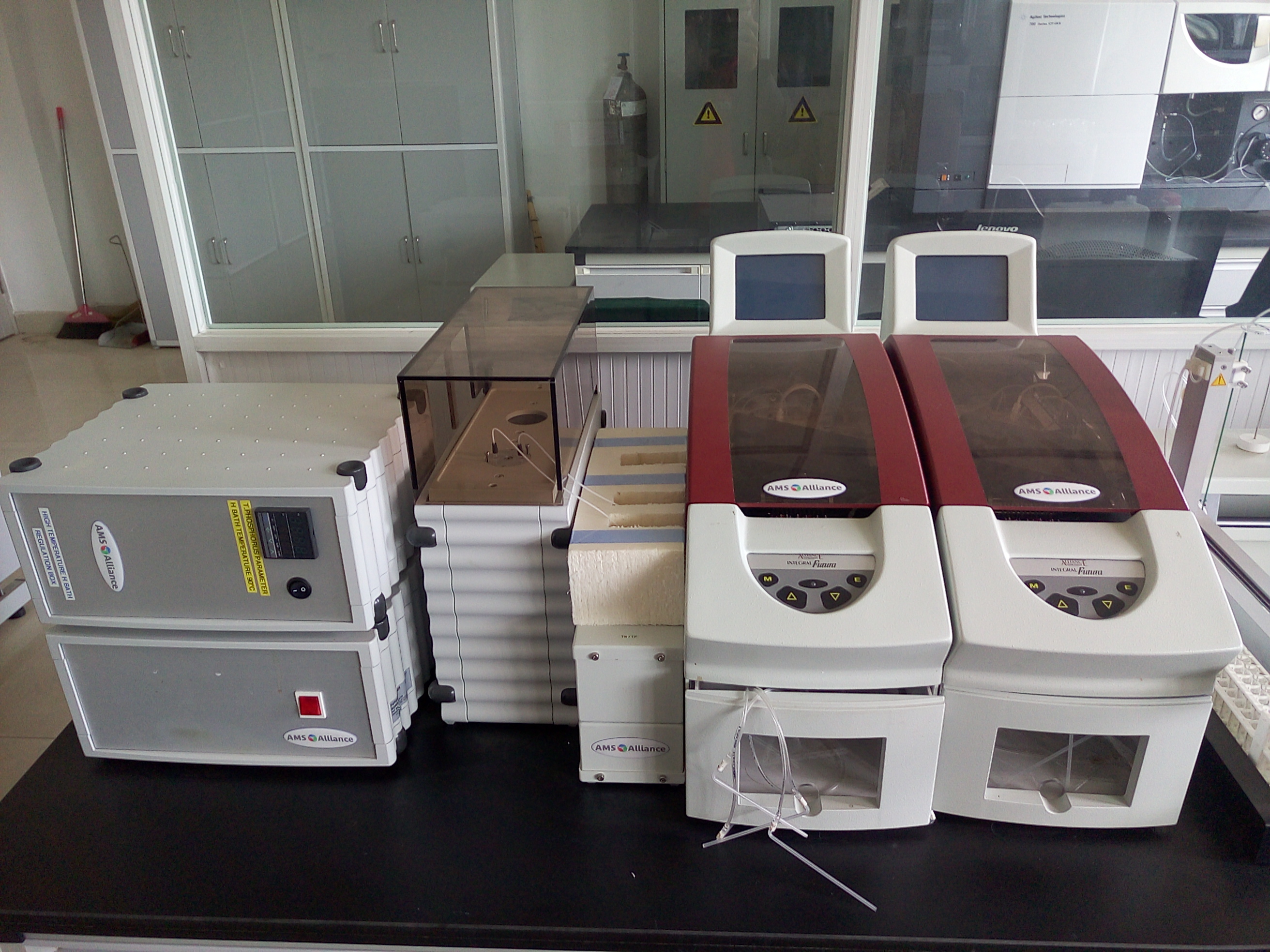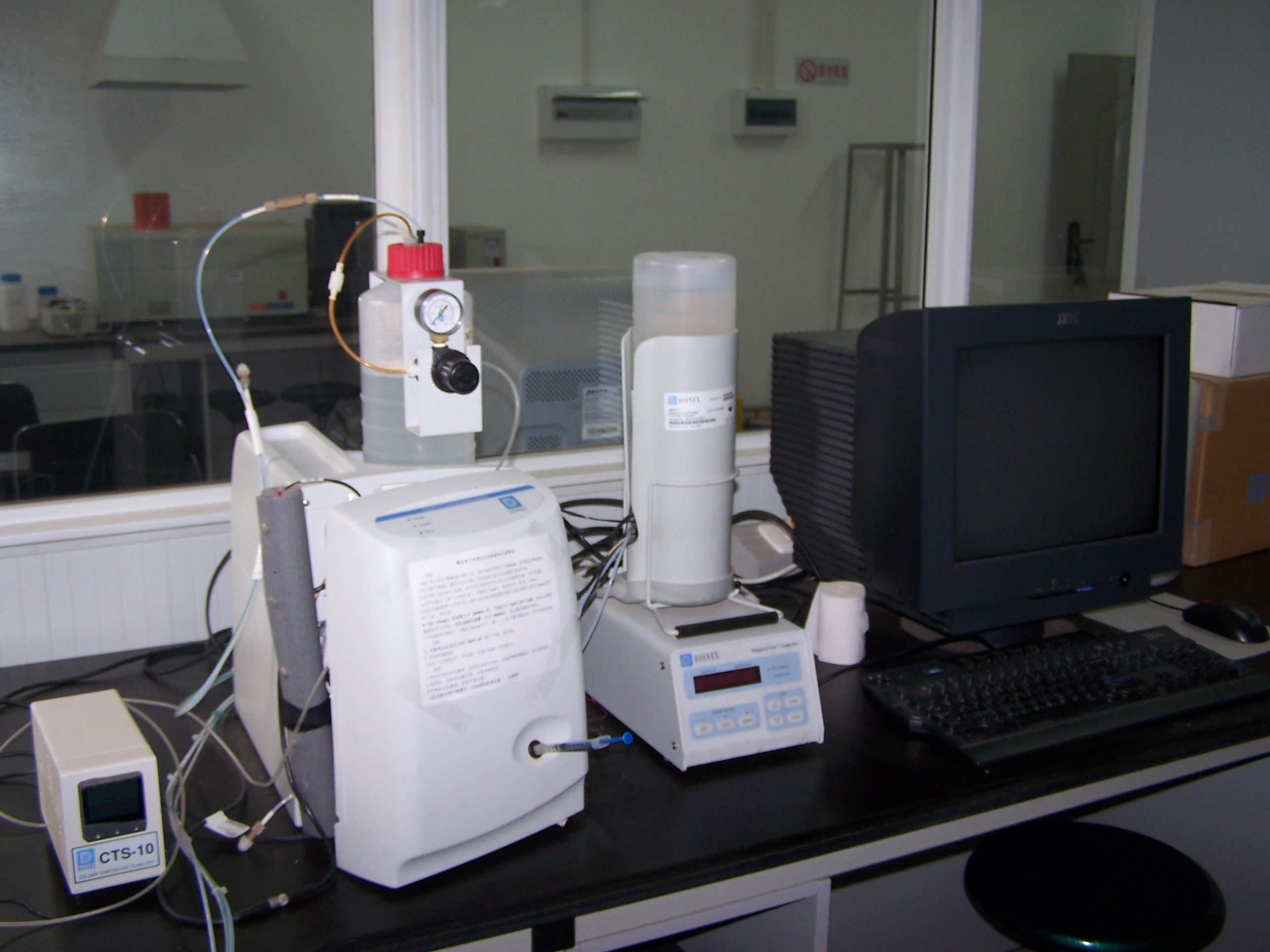 大型仪器实验室常规检测仪器,包括安捷伦710+ETHOS1等离子体发生光谱仪、安捷伦640-IR傅里叶变换近红外光谱仪、北京瑞利WFX-130A原子吸收分光光度计、美国戴安ICS-90离子色谱仪、青岛普仁PIC-10离子色谱仪、岛津GC-14气相色谱仪、美国WATERS515液相色谱仪、美国14-9000-100TOC分析仪、德国WTW OxiTop IS12数字式BOD测定仪、德国WTW Photo Flex水质分析便携实验室、北京普析TU-1810PC紫外可见分光光度计等多种大型进口与国产精密分析仪器。