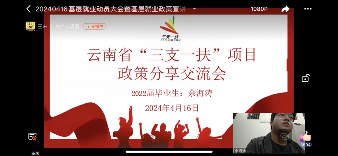 随后,就职于云南省华宁县通红甸乡政府的西部计划志愿者孔令英、昭通市大关县靖安新区的特岗教师王龙巧和昆明市晋宁区双河彝族乡政府的“三支一扶”余海涛开展经验分享,他们分别从考上基层单位前的准备、目前的工作情况与发展前景等方面,与同学们进行分享和互动,用亲身经历鼓励同学们投身基层,到祖国最需要的地方去就业。