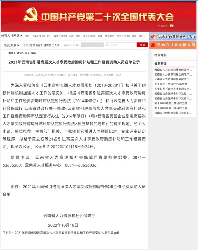 2022年10月18-24日,云南省人力资源和社会保障厅公示了“2021年云南省引进高层次人才享受政府购房补贴和工